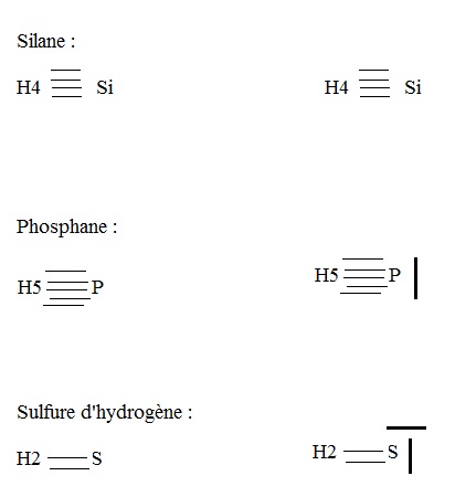2. Le silane, le phosphane, et le sulfure d'hydrogène sont des molécules uniquement constituées d'hydrogène et respectivement de silicium, de phosphate et de soufre. Donner la formule brute de chacune de ses molécules ainsi que leur représentation de Lewis.
