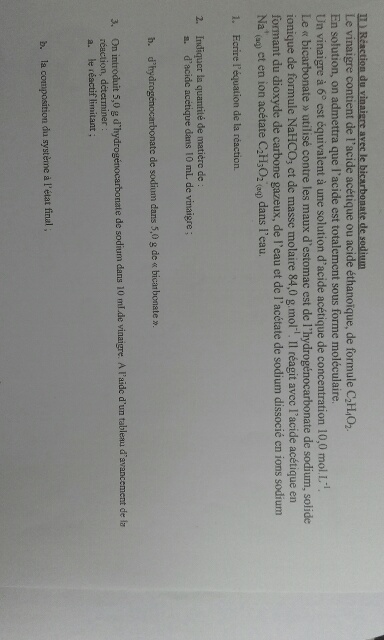 L'équation de la réaction est C2H4O2+2NaHCO3 -> 2C2H3O2(-) + 2Na(+) ?