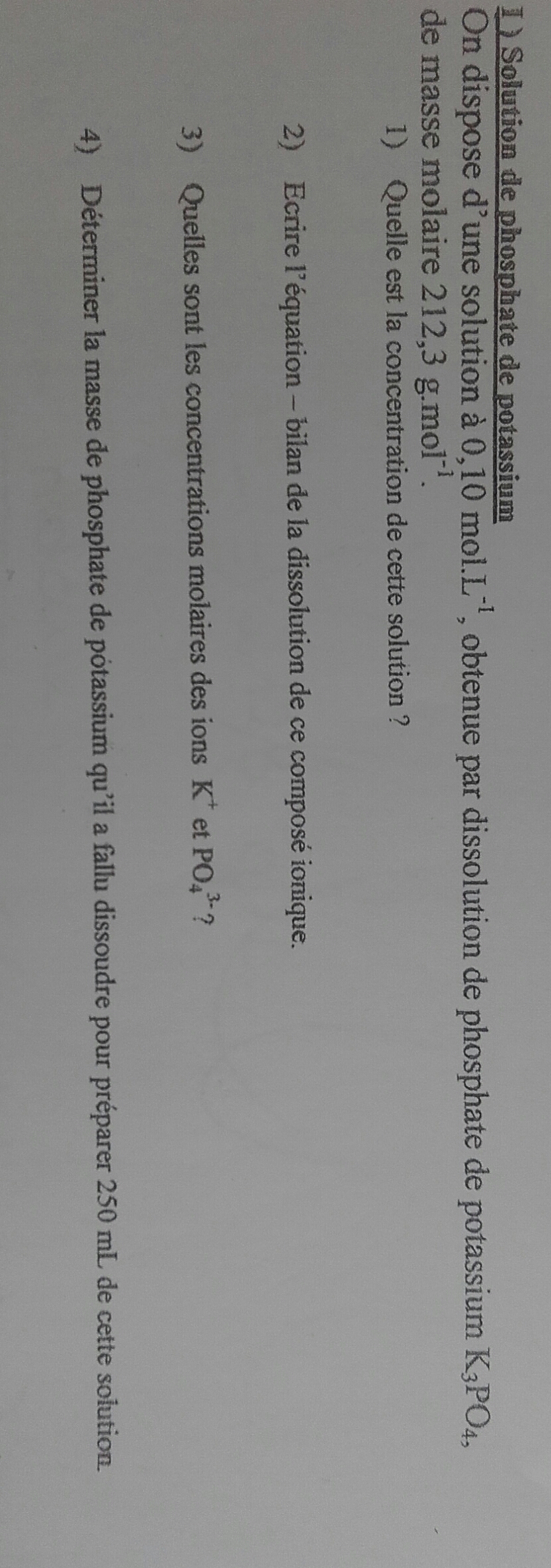 3) K3PO4 --> 3K+ + PO(3+ en haut et 4 en bas)