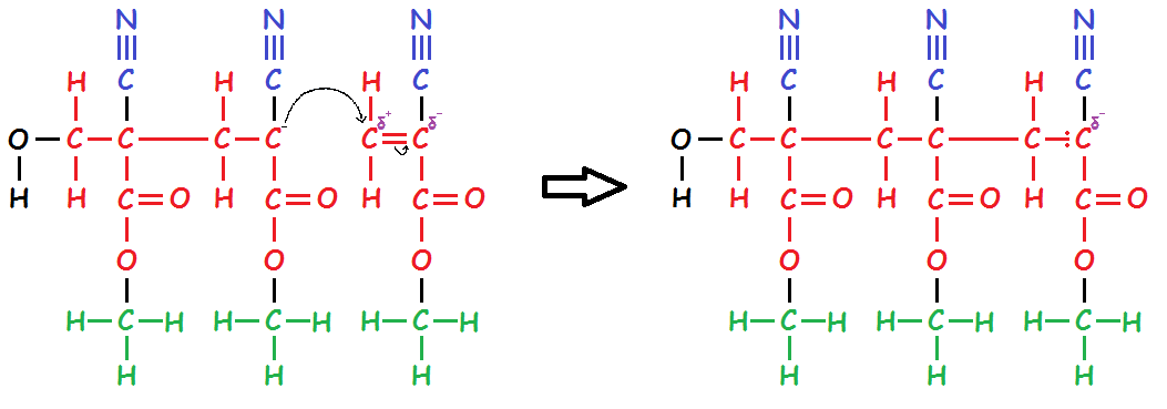 Vos premières questions, qui portaient sur la polymérisation du cyanoacrylate de méthyle, évoquaient une réaction initiale entre le O d'un HO- ou d'une molécule d'eau, formant une liaison covalente avec un carbone de la molécule de cyanoacrylate de méthyle.