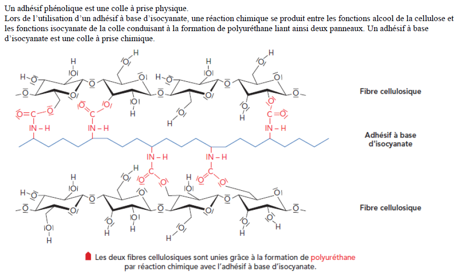 Par exemple entre le papier et un adhésif isocyanate, les liaisons covalentes sont le résultat du polyéthane (uréthanes) :