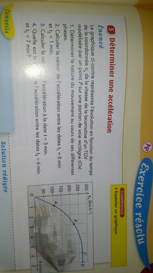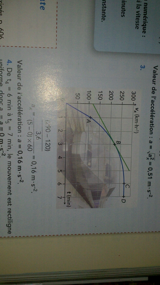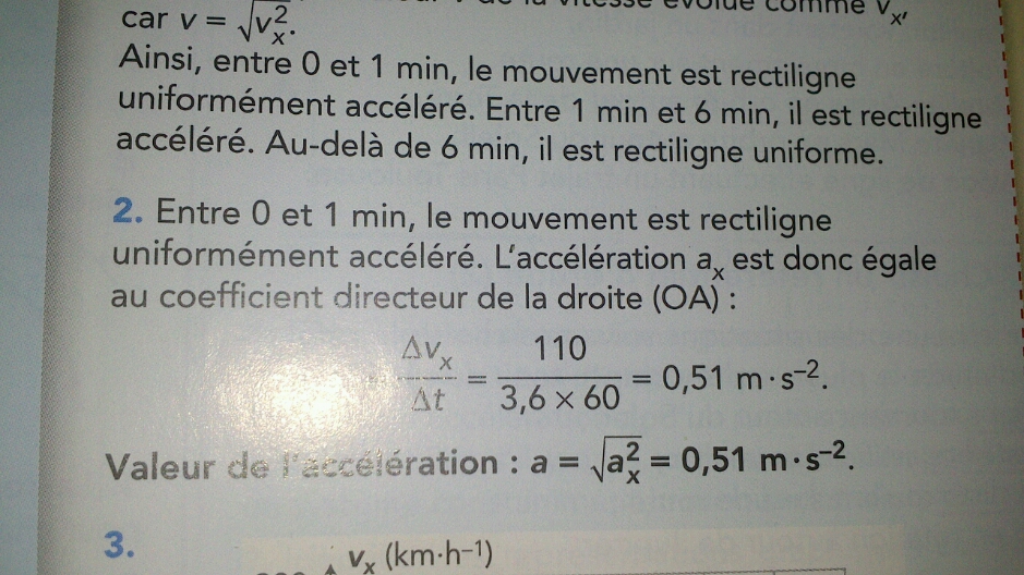 Dans la question 2, la vitesse étant proportionnelle au temps entre t=0 min et t=1min, l'accélération est le rapport de la variation de vitesse sur la variation de temps. La vitesse en t=1 min est de 110 km/h en t=0 min, la vitesse est de 0 km/h. La variation de vitesse entre les deux instants est donc de 110-0=110 km/h. 2tant donné que l'on veut une vitesse en m/s, il suffit de diviser les km/h par 3,6. En effet, il faut multiplier par 1000 pour passer des km au m et il faut diviser par 3600 pour passer des heures au secondes soit un division par 3,6. Le tout est alors divisé par la variation de temps soit 60s (nombre de secondes dans 1 minute). Ceci nous donne 110/(3,6*60).