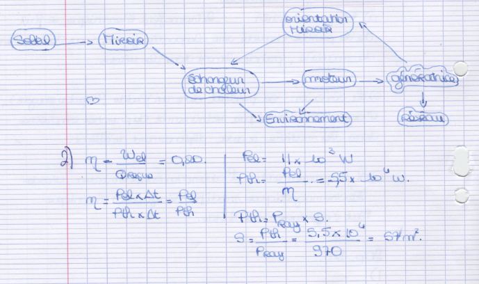 La puissance thermique est calculée à partir du rendement de 20% et vaut aussi le produit de la puissance rayonnée par la surface éclairée, d'où le dernier calcul.