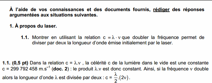 j'ai une question vis à vis d'un corrigé de labolycée (ci-joint) je voulais savoir si on pouvait justifier cette question en disant que lambda= vitesse/fréquence et que par conséquent lorsque la fréquence double alors lambda est divisé par 2?