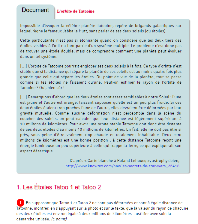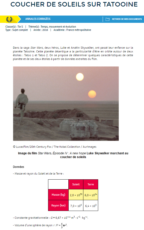 L'un des exercices du sujet métropole 2016 portait sur l'étude des soleils en orbite autour de la célèbre planète Tatooine provenant de l'univers de Star Wars.