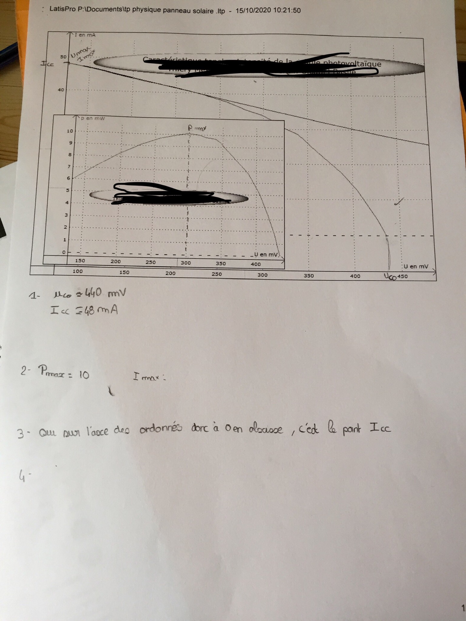 2. À partir du graphique représentant l’évolution de la puissance électrique P et en fonction de la tension I, déterminer la valeur PMax de la puissance maximale délivré par la cellule. En déduire les valeurs de Imax et Umax correspondantes