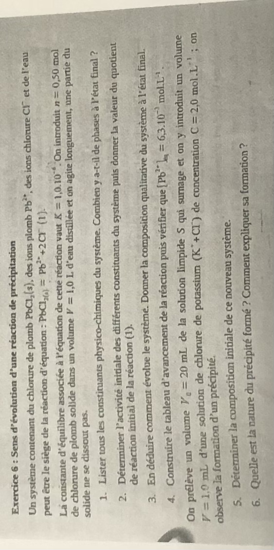 Un système contenant du chlorure de plomb PbCl , des ions Pb2+ et des ions Cl- peut être le siège de la réaction suivante : PbCl2(s)=Pb^2+ +2Cl^-