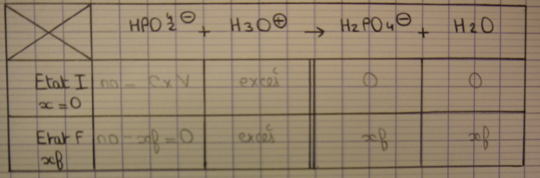 Ce tableau serait exact si d'une part l'ion oxonium est en excès et si d'autre part la réaction acide base était totale c'est-à-dire disparition de l'espèce chimique limitante dans votre cas \(HP{ O }_{ 4 }^{ 2- }\) puisque vous avez supposé que \({ H }_{ 3 }{ O }^{ + }\) est en excès.