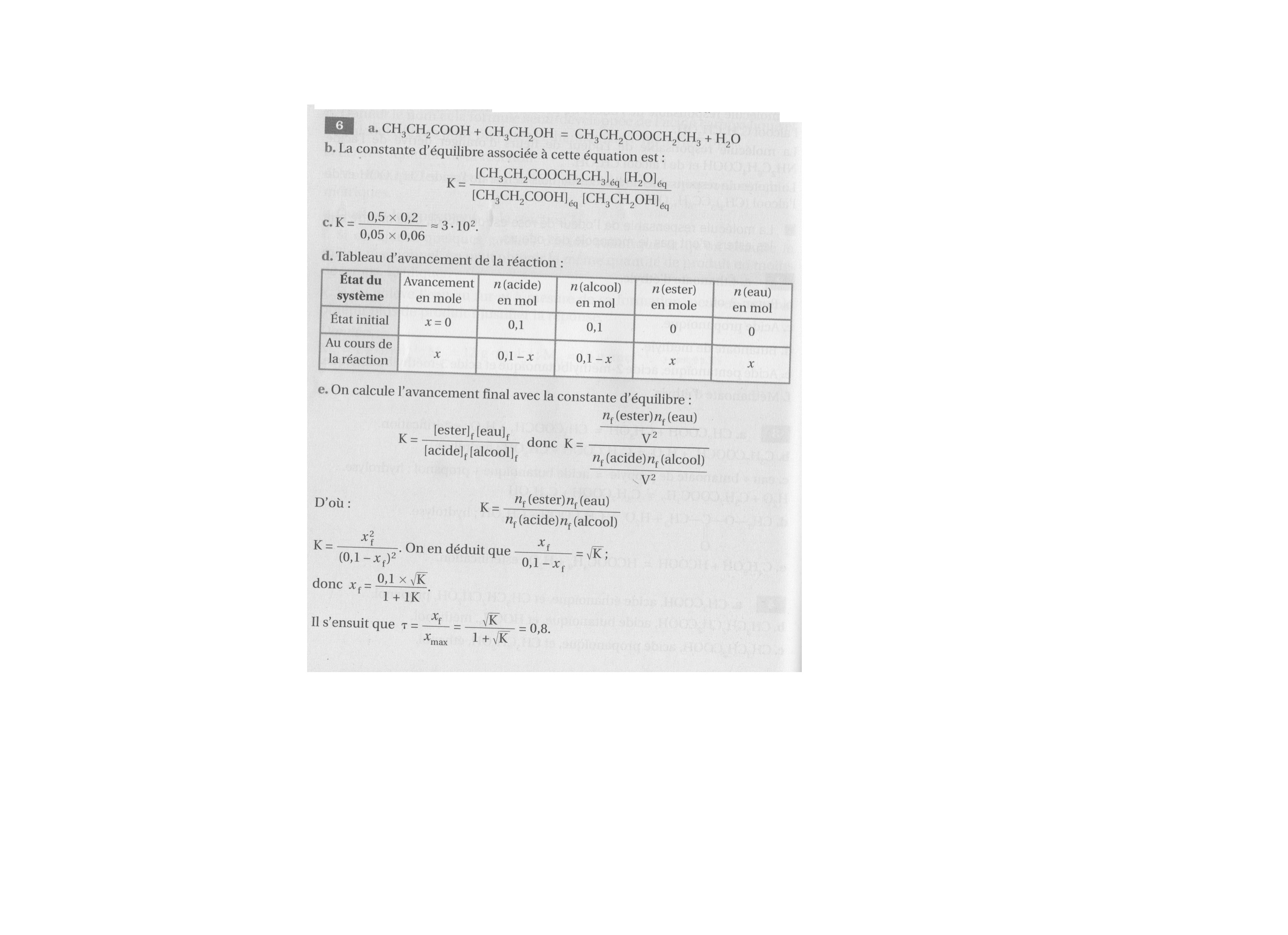 La réponse vous montre comment est calculée la constante d'équilibre K à partir de sa définition (pour les concentrations) et du tableau d'avancement pour calculer ces concentrations. Le voyez-vous ?