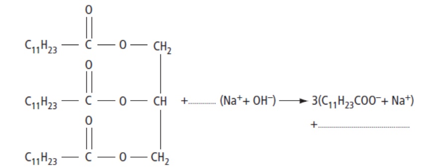 Pour l'équation suivante, cherchez, dans votre cours, ce que donne l'action de la soude sur un triglycéride : un savon, oui et .....
