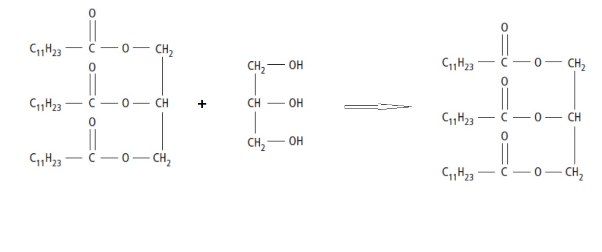 3) En traitant le tricylécride obtenue à la question 2, par l'hydroxyde de soduim (ou soude) de formule Na+ + OH-, on fabrique le savon de formule chimique CH3-(CH2)10-COO- + Na+, appelé laurate de soduim.