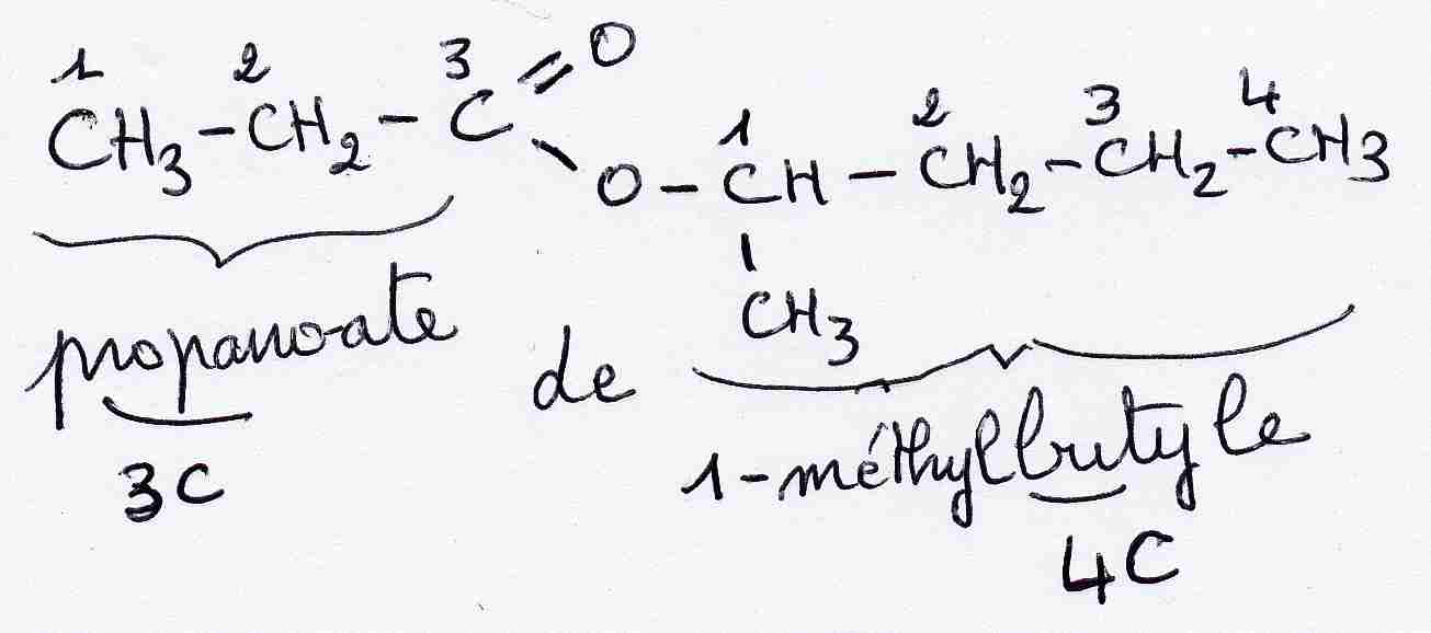 Exemple : H3C-CH2-COO-CH3 est du propanoate de méthyle. H3C-COO-CH2-CH3 est de l'éthanoate d'éthyle. Je joins un exemple scanné qui devrait vous aider, en cas de problème, n'hésitez pas à revenir...