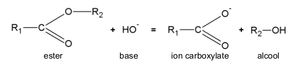 Je vous joins deux images : l'une correspond à la saponifation (autre nom de l'hydrolyse basique d'un ester) et l'autre à la synthèse d'un savon (qui est une saponification mais toutes les saponifications ne sont pas des synthèses de savon, attention au vocabulaire).