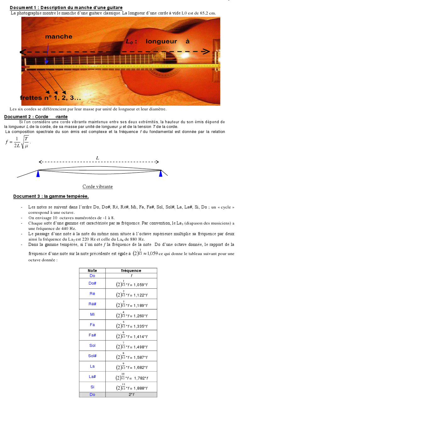 " Si f(i) est la fréquence du son émis lorsque la corde est bloquée sur la frette n°i et Li la longueur alors utile de la corde, on a : Li= (1/2f(i))* (racine carrée(T/u)