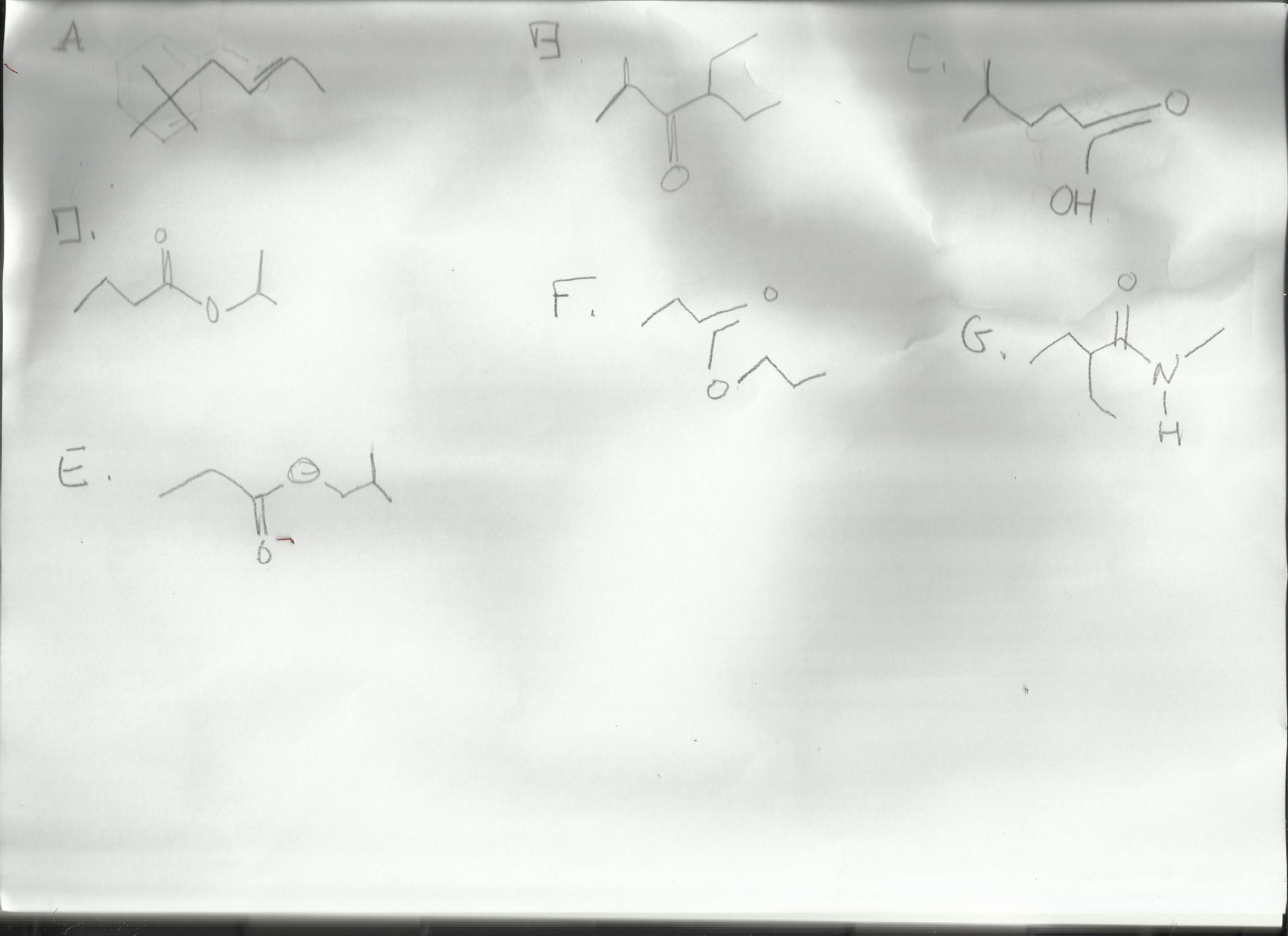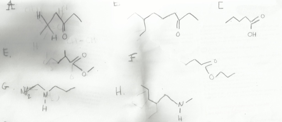 Je suis un peu perdu entre D, E et F, il doit m'en manquer un dans la liste donnée initialement. Idem pour G et H, puisque je n'ai même pas de H dans la liste initiale ! Je suppose que G est le N-méthyl-N-éthyl-propan-2-amine et H le N-éthyl-3-méthylpentanamide.
