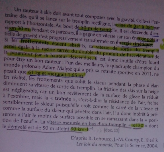 Dans le cas du tremplin K120 le dénivelée est de 50m donc une vitesse de 112,8km/hsans frottement à comparer avec les 90km/h en réel.