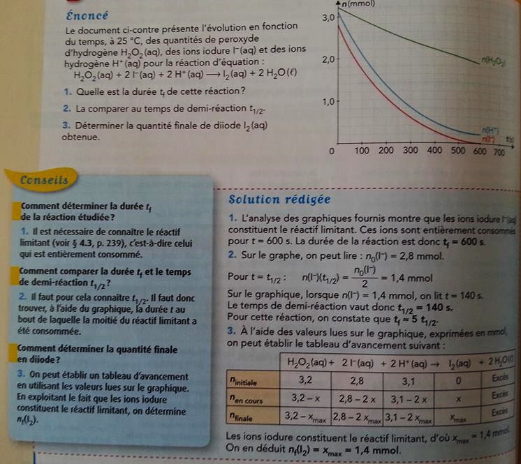 Dans cet exercice votre méthode est correcte, mais cette méthode n'est pas générale : elle n'est valable que lorsque la réaction est totale et si le coefficient stœchiométrique de l'espèce chimique dosée est 1.Je ne comprends pas, car moi j'aurais commencé par calculer xmax (ici 1.4 mmol) puis diviser par 2 pour trouver n(t1/2) je comprends pas pourquoi il prennent la quantité initiale de I- pour calculer la demie-réaction