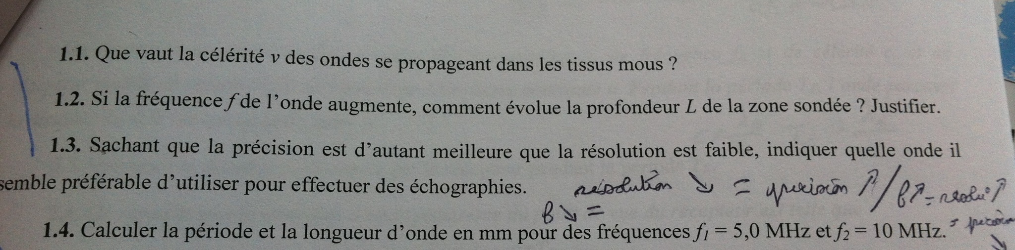 On me demande quelle onde il est préférable d'utiliser pour faire une échographie. On me précise que la précision est meilleure quand la résolution est faible. Dans le document on me dit que la résolution est d'autant meilleure que la fréquence est élevée. Donc plus la fréquence est élevée plus la résolution est bonne et plus la précision est mauvaise. Nous on veut donc l'inverse, plus de précisions avec des ondes basses fréquences, c'est ce que j'ai répondu et j'ai eu faux ... Et dans le corrigé que j'ai eu ils nous disent qu'il faut des ondes hautes fréquences donc je ne comprends pas ... Mon raisonnement est bien logique ?