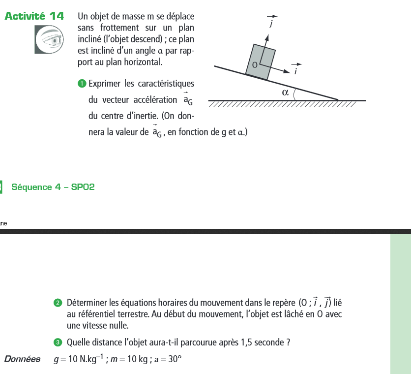 Bonjour, le poids est un vecteur vertical. Sur le schéma joint, il vous faut trouver la composante Px du vecteur poids sur l'axe orienté par le vecteur i.