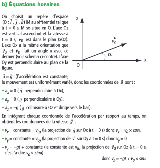 donc dans le schéma le système se trouve au points 0, Vo représente le vecteur vitesse, Pourquoi il est dirigé de cette façon comment on détermine sa direction ?le points m tombe à la verticale étant donné qu'il est en chute libre ? alors pourquoi les équations horaires donne une fonction polynomial de second degré donc une parabole, ce ne devrait pas être une droite verticale ?