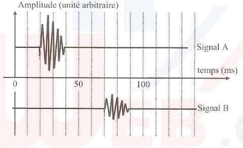 Si le signal B est celui d'un récepteur d'US, l'onde sonore a mis une durée de 50 ms pour parcourir la distance D.