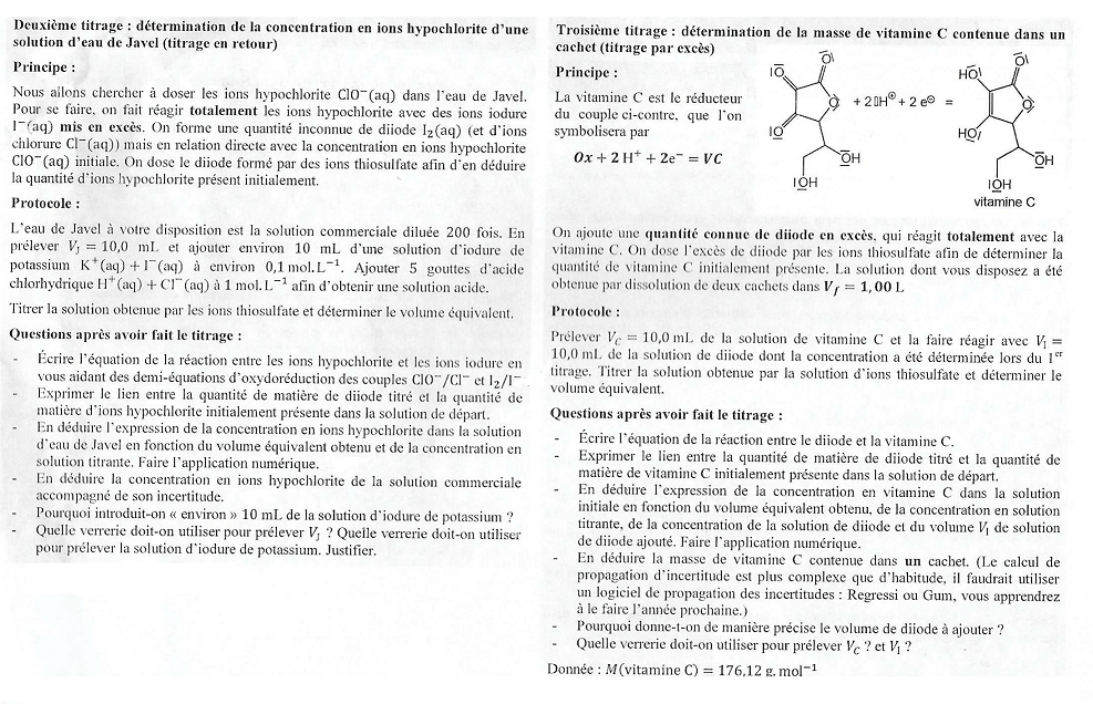 Pour la dernière question (verrerie pour prélever Vj et la solution d'iodure de potassium), j'ai pensé à une pipette jaugée pour prélever Vj car on doit avoir un volume très précis. Pour l'iodure de potassium, comme on en prélève "environ" 10 mL, j'hésitais entre la burette graduée et l'éprouvette graduée... Que me suggérez-vous ? Et comment justifier ?