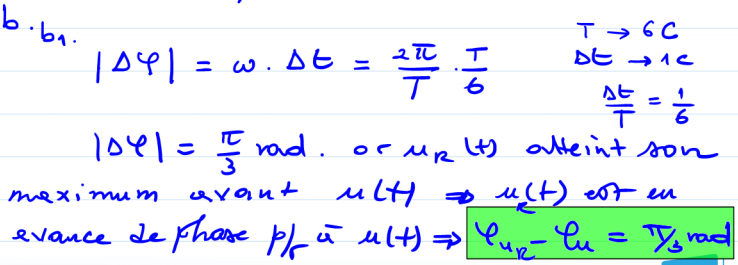 Maintenant, la réponse à votre question est donnée dans la phrase : UR atteint son maximum avant U, donc son déphasage par rapport à U est positif. On aurait pu écrire delta phi = phi U - phi UR = - pi/3.