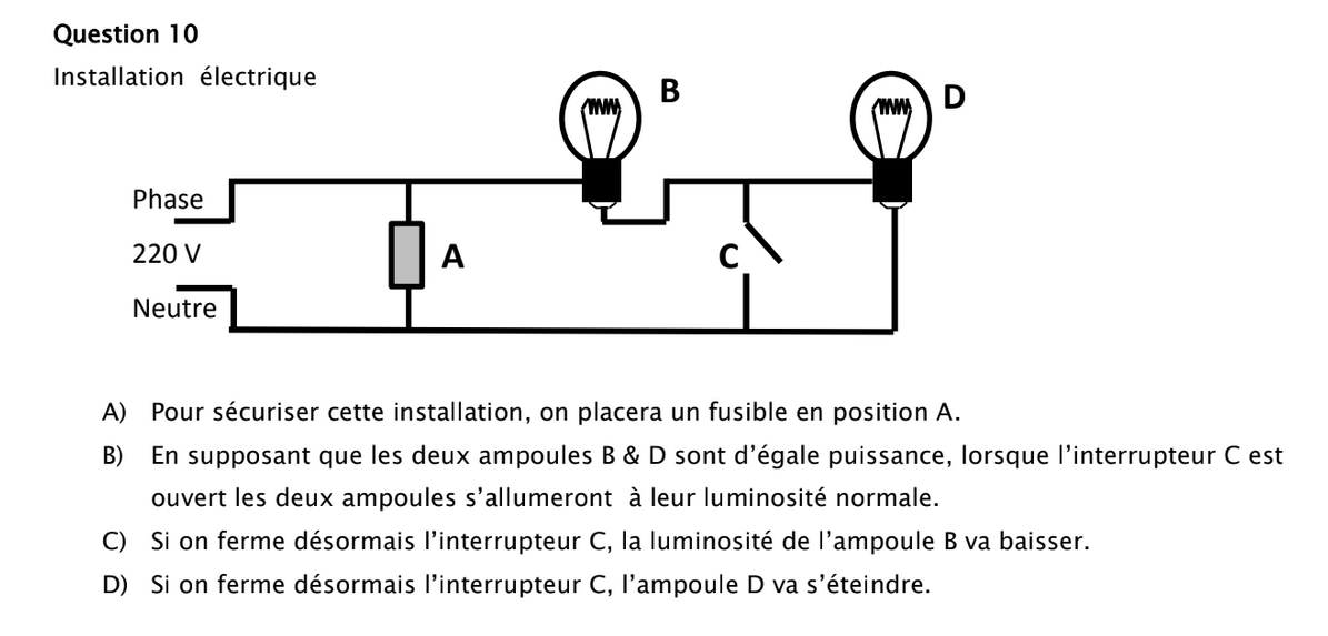 Dans le cas où l’interrupteur est fermé, le conducteur ohmique A et l'ampoule B sont en dérivation, la tension aux bornes de B est de 220 V alors que la tension aux bornes de D est nulle (lampe éteinte).