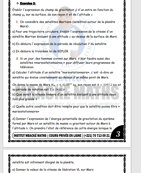 Bonjour, il faut effectivement que la période de rotation du satellite autour de Mars soit égale à la durée nécessaire pour que Mars fasse 1 tour sur elle même. Et il faut enfin que la trajectoire se trouve dans le plan équatorial de Mars.