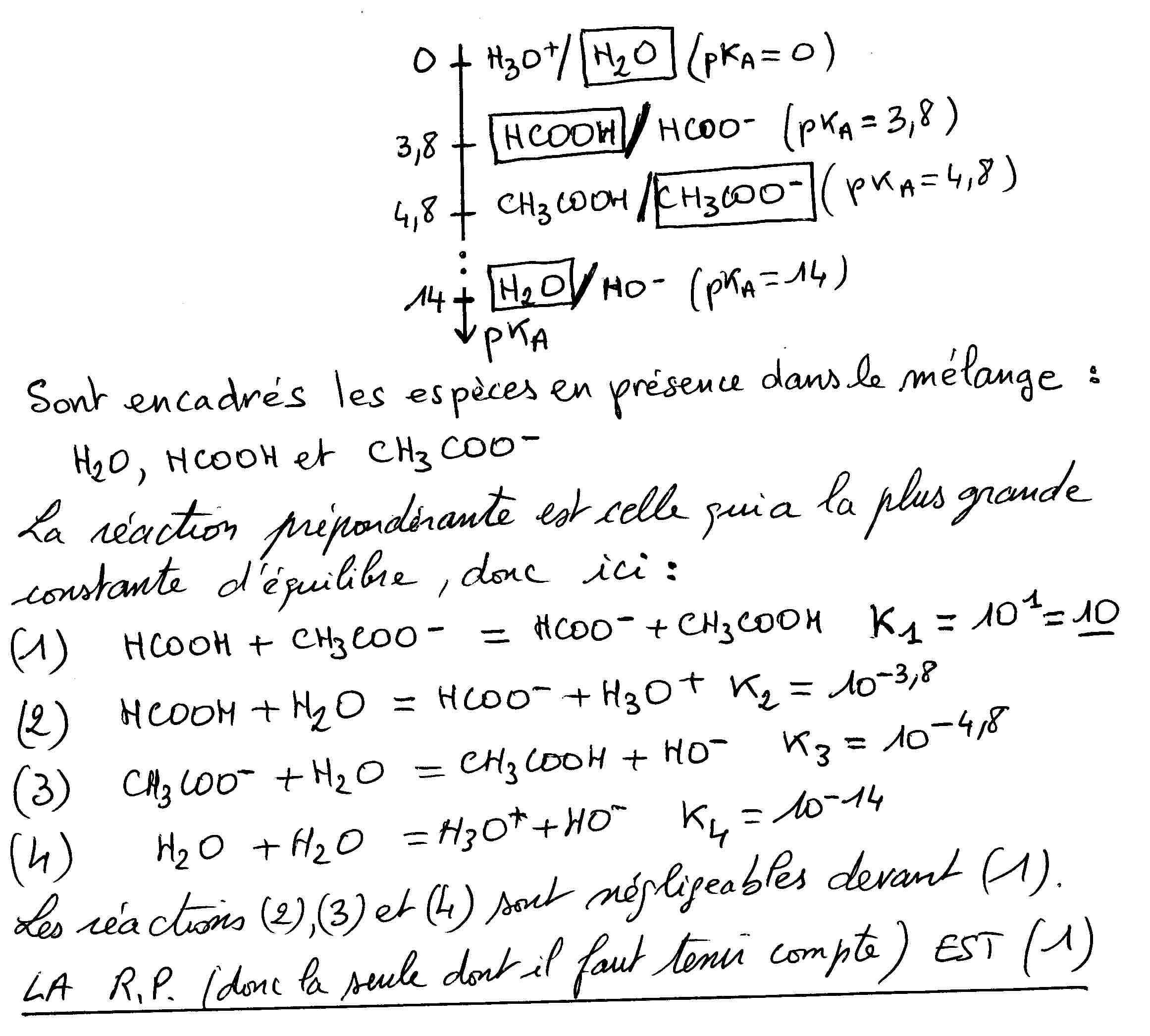 Ma question est : Pourquoi fait on intervenir d'un coup le couple "H2O/HO-" tout d'un coup, et comment savoir si il faut utiliser le couple "H3O+/H2O" ou le couple "H2O/HO-". Pourquoi n'utilise t-on pas le couple correspondant à l'acide méthanoïque dans ce cas là ?