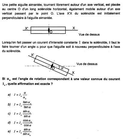 Voici ci-joint, un exercice dont je ne comprends pas la réponse (E). Pour moi, il n'y aucune de réponse de bonne car celle-ci est I = I0.tan(alpha)/tan(alpha0).