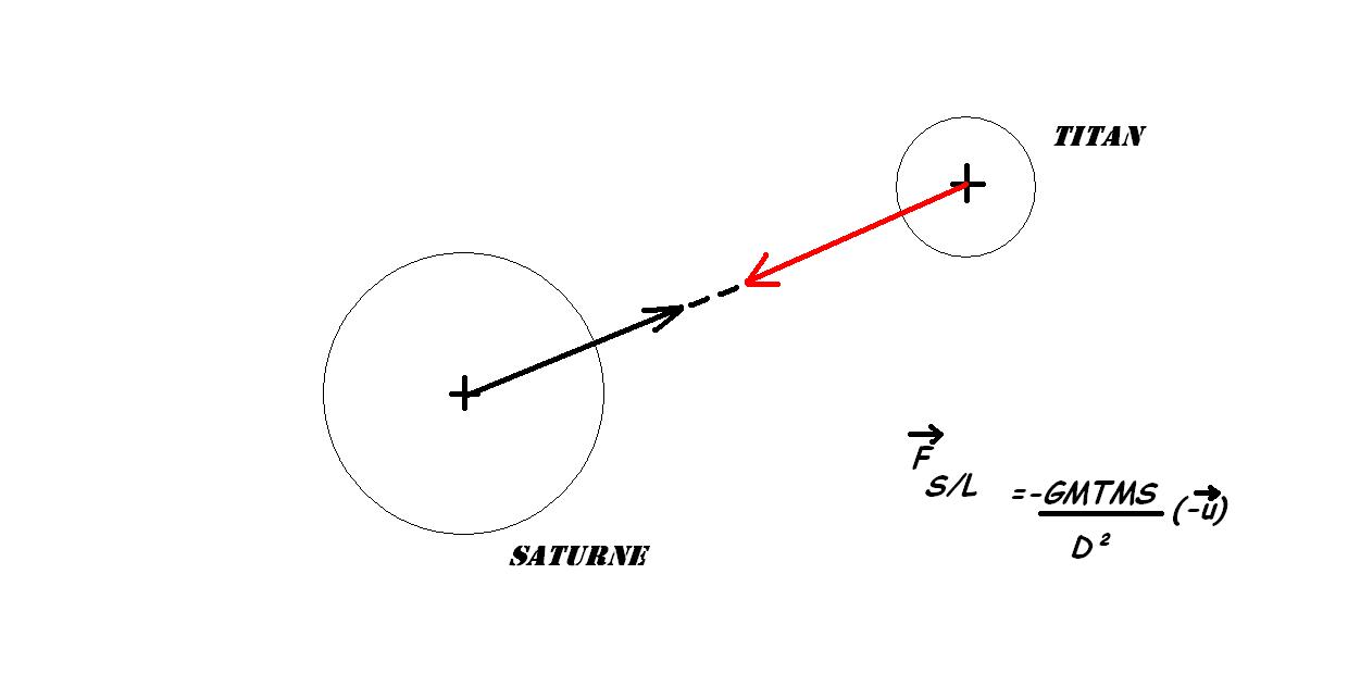 il y a deux forces représentées sur le schéma alors que l'on vous demande de représenter la force exercée par Saturne sur Titan. Je vous conseille plutôt de dessiner le schéma à la main puis de le scanner . par ailleurs, dans l'expression figure un vecteur unitaire u non représenté sur le schéma.