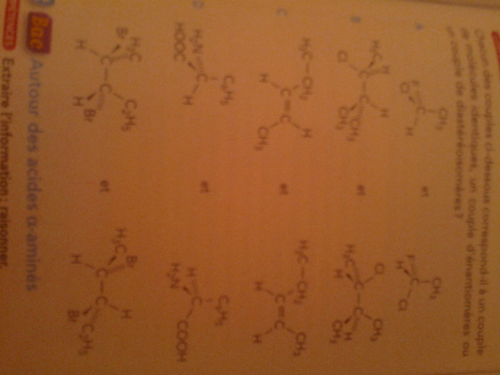Bonjour ne comprend pas pourquoi , le A) est un énantiomère , que le B et D sont des molécules identiques et E un diastéréoisomère , moi je trouve A)diastéréoisomère est un , que le B et D sont des molécules énantiomères et E aussi , j'aimerais savoir qu'elle technique utiliser pour savoir . Merci ( désolé pour la qualité du scan )