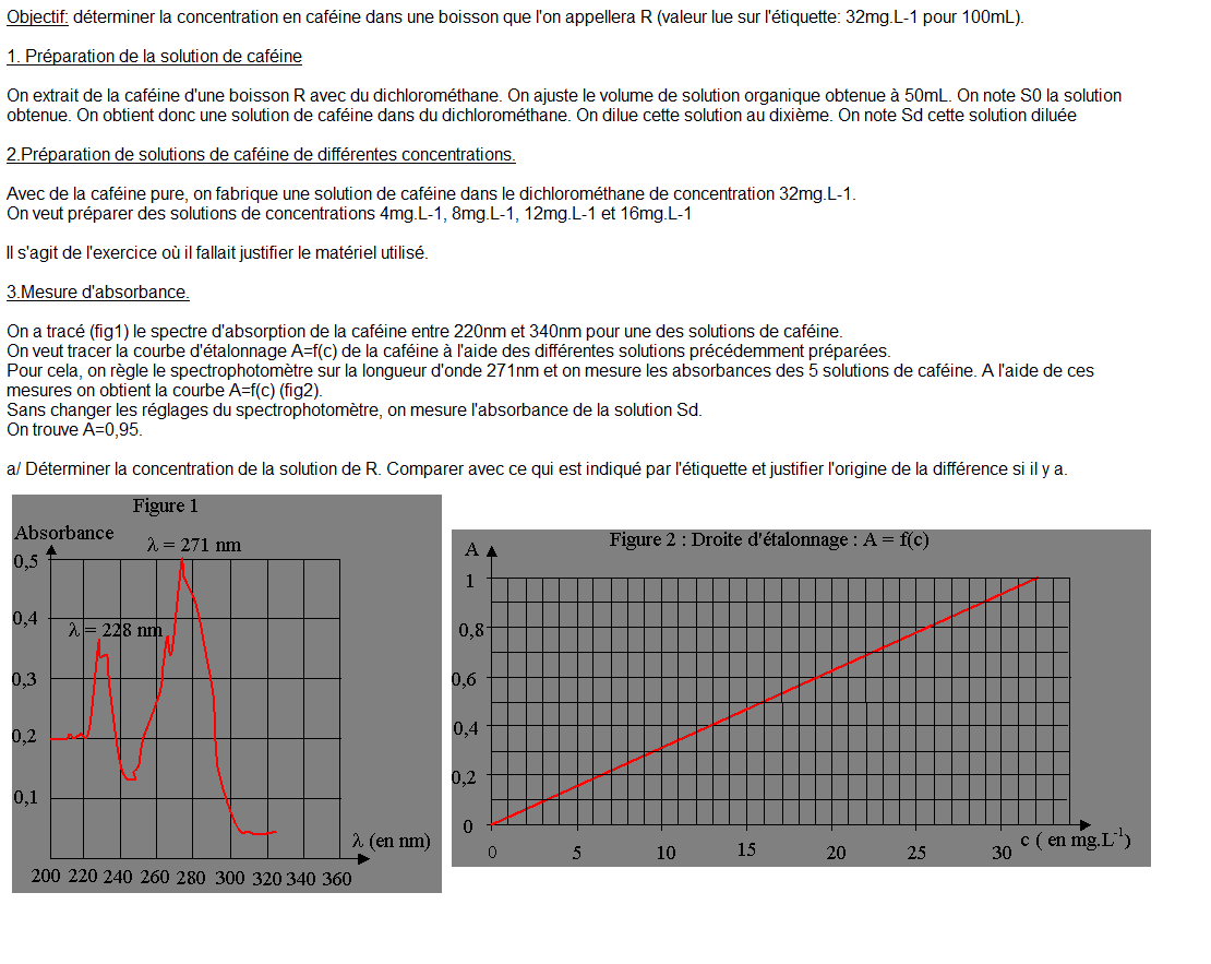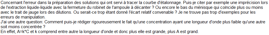 Merci pour l'énoncé. Je me doutais un peu que vous aviez déterminé la concentration massique à l'aide d'une courbe d'étalonnage. Vous avez effectué une détermination graphique de la concentration en caféine. Cette lecture graphique n'est-elle pas entachée d'une erreur de lecture?