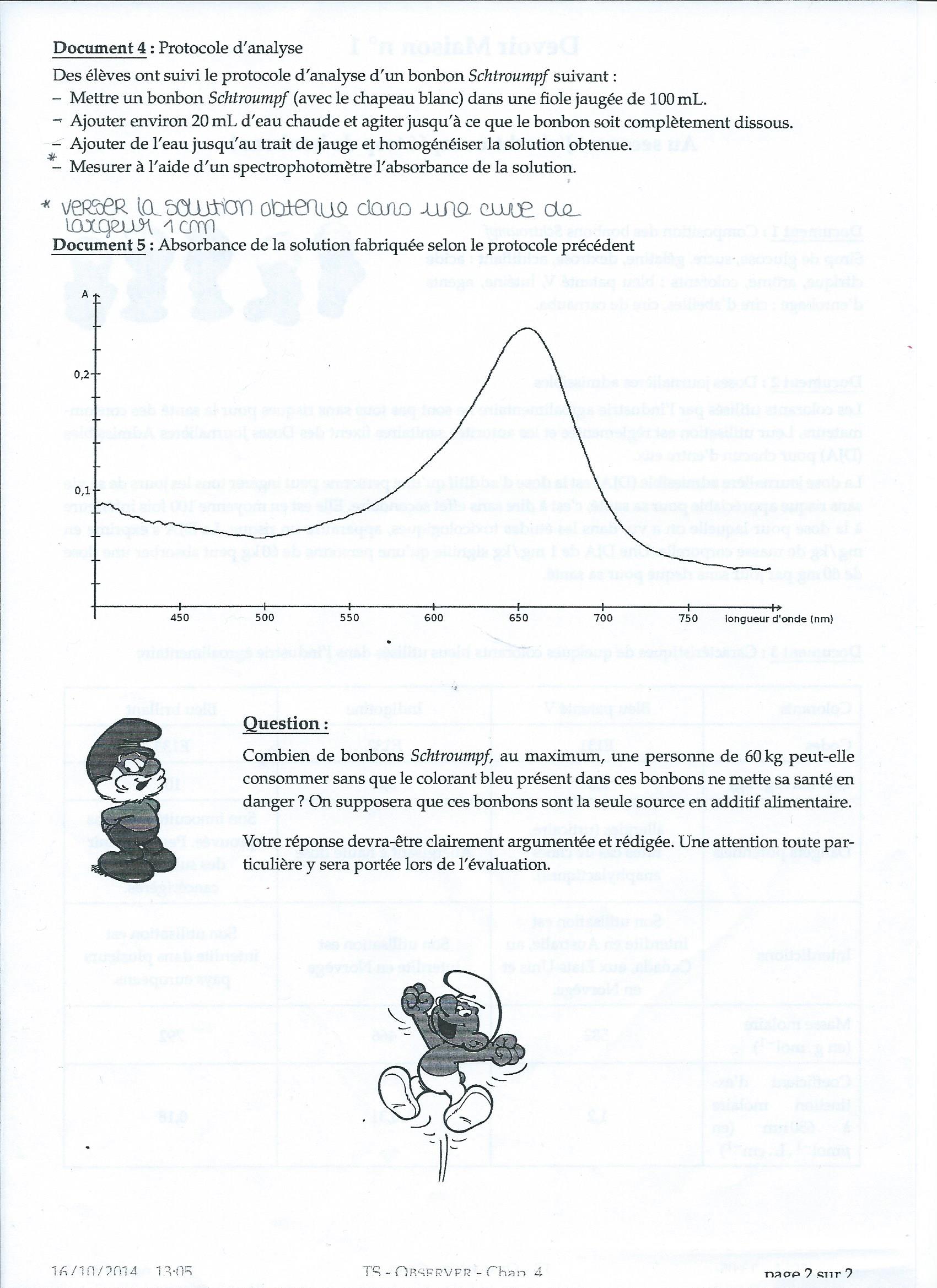 Avec votre cours ou le livre ou tout autre source vous devez pouvoir écrire la relation (linéaire) qui existe entre l'absorbance et la concentration de la solution. Le doc 2 donne la largeur de la cuve dans laquelle il y a la solution de bonbon Schtroumpf.