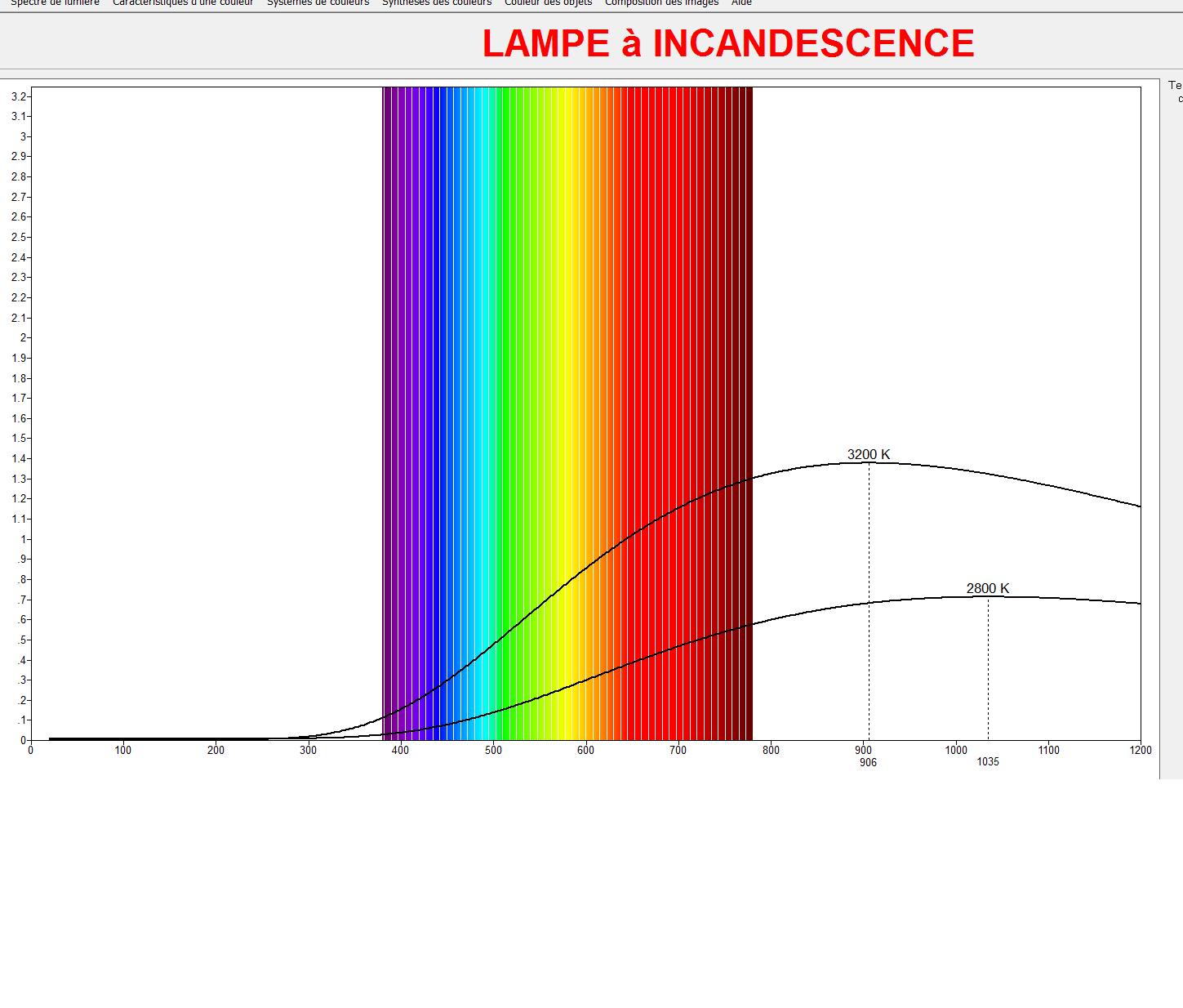 2) Quand la température du filament de la lampe à incandescence ordinaire augmente, son spectre émet une lumière de plus en plus blanche et le maximum d’émission diminue.