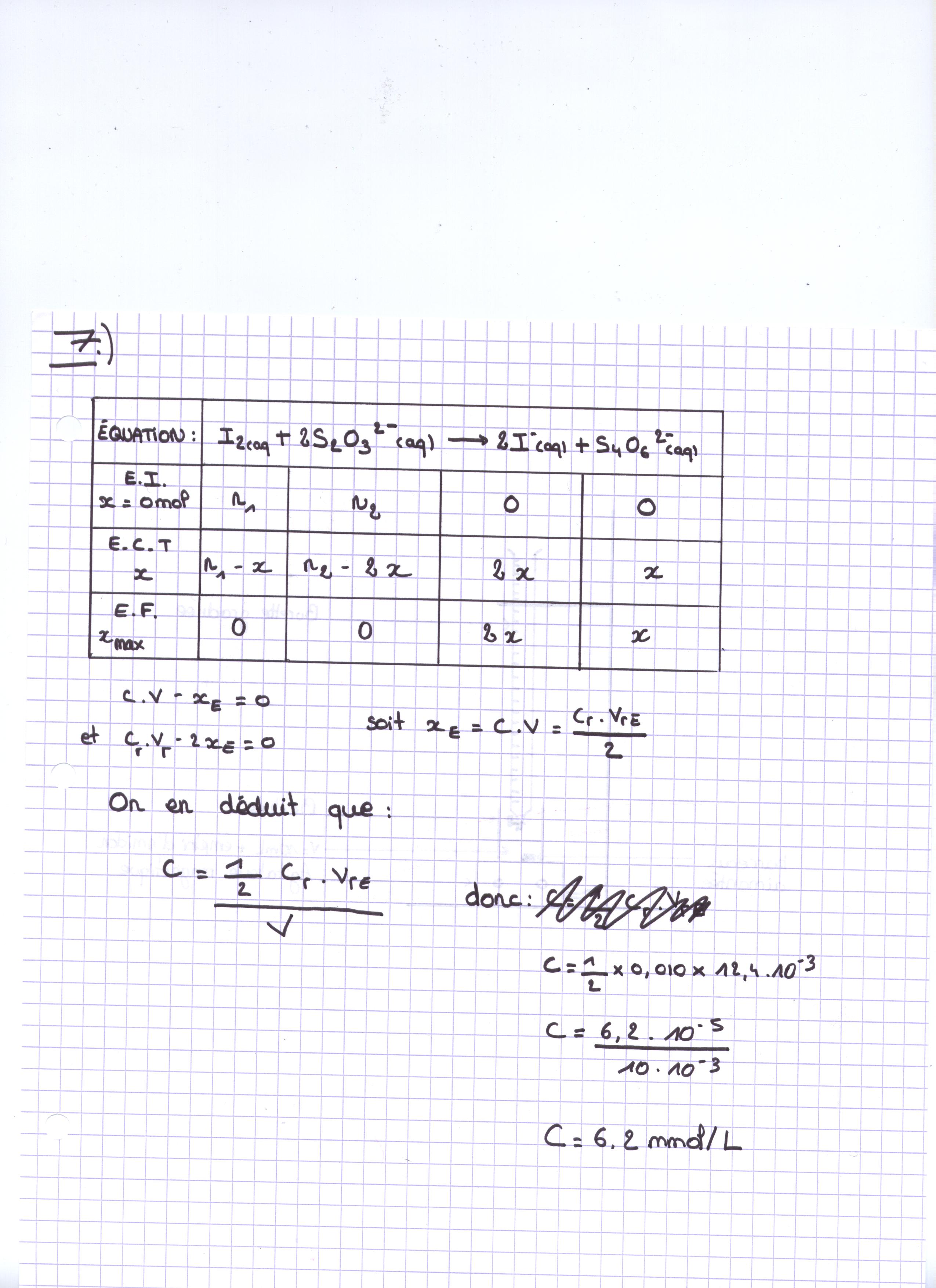 6) Avant l'équivalence, il reste des ions thiosulfate dans le bécher, il s'agit donc du réactif limitant.