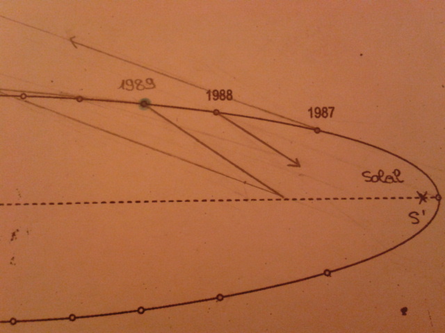 * J'ai reporté ce vecteur a la date 1988. Je n'ai pas tenu compte de sa longueur mais on voit directement qu'il n'ai pas orienté vers le soleil. Je ne comprends vraiment pas, voila une dizaine de fois que je recommence depuis le départ...