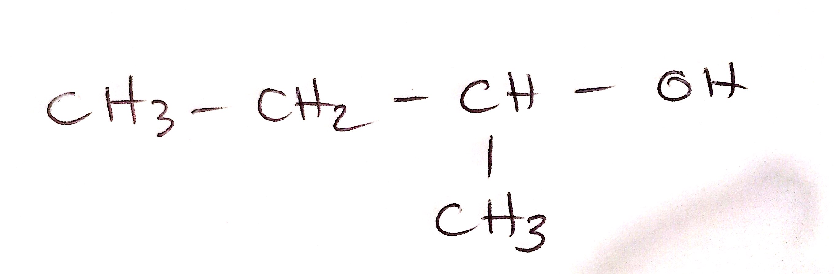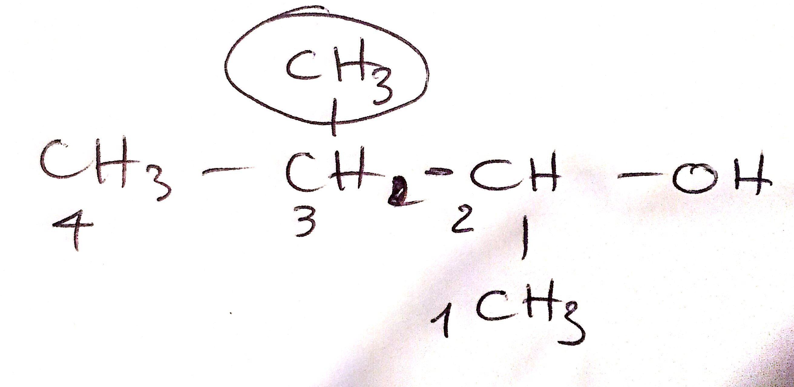Par exemple, dans le cas ci-dessous, Ici, nous avons la chaine principale partant du carbone d'en bas permettant d'avoir le numéro du carbone fonctionnel le plus bas (2). On a donc du butan-2-ol.