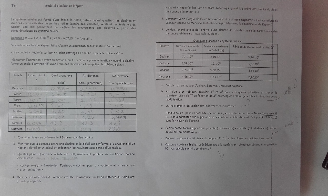 C'est un long exercice sur les lois de Képler, grâce à un logiciel j'ai rassemblée dans un tableau : l'excentricité e, le demi grand axe a (ua), la distance entre le Soleil et la planète appelée R1, la distance entre le Soleil et le foyer appelée R2 de chaque planètes (Mercure, Vénus, Terre, Mars, Jupiter, Saturne, Uranus et Neptune).