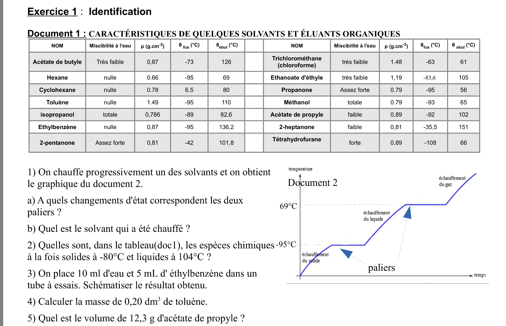 2-se sont les espèces chimiques qui fussent à moins de -80c et ebullisent á plus de 104 : Toluène , ethylbenzene,ethanoate d éthyle