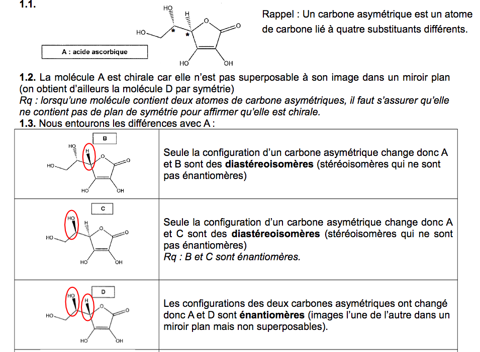 II. Ensuite, dans un sujet de bac, j'ai trouvé ça. Je ne comprends pas pourquoi quand un seul carbone asymétrique change, alors les molécules A et B sont diastéreoisomères et quand les 2 carbones asymétriques changent alors A et D sont énantiomères. (voir image 2 jointe)