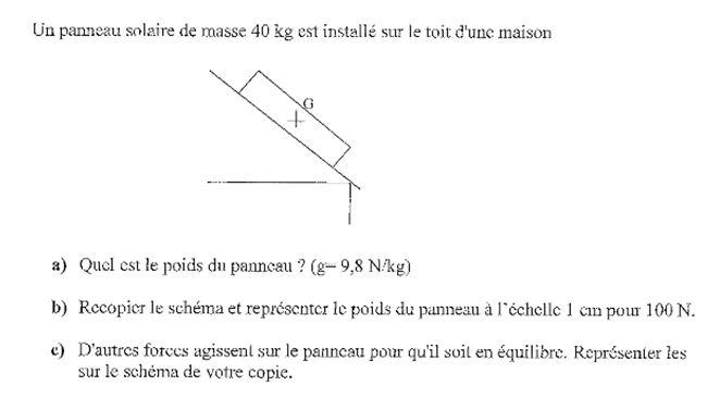 2) dans la question c), il est précisé que le panneau est en équilibre donc immobile. D'après le Principe d'Inertie, ce panneau est donc soumis à des forces qui se compensent, cela signifie dans ce cas que le poids et la réaction du toit ont même direction (verticale), même valeur et des sens opposés. Donc non le vecteur réaction n'est pas perpendiculaire au toit.