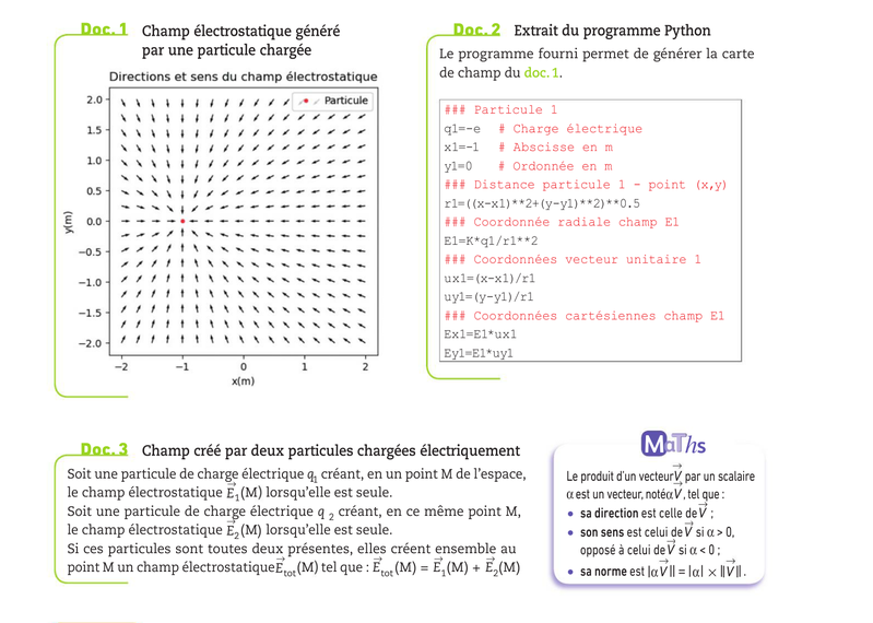 2a)Le programme Python du document 2 a produit la carte de champ du document 1.En utilisant le document 3, le modifier pour qu'il produise la carte du champ éléctrostatique créé par la particule de charge q1, déjà présente et une autre particule de charge électrique q2=e, positionnée en (x2=1m ; y2=0m ) Executer le programme ainsi modifié