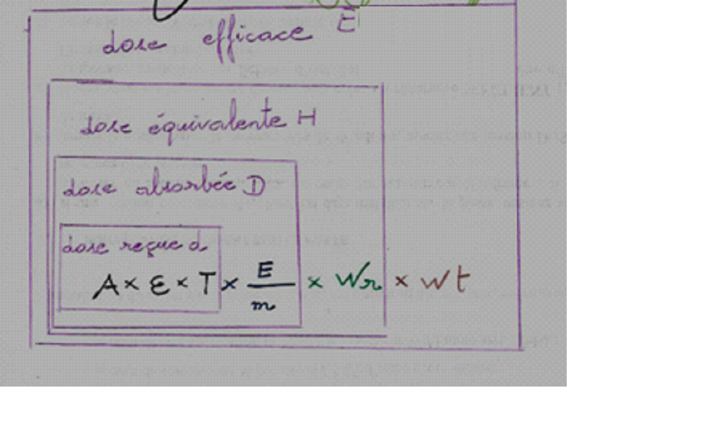 Pour la dose absorbée, on ne prend en compte de l'énergie reçue et de la masse de la matière irradiée. Puis, puis la dose équivalente, on ajoute en plus les différences d'irradiation entre les différentes particules ou rayonnements irradiants. Et finalement pour la dose efficace, on ajoute encore la nature des tissus irradiés