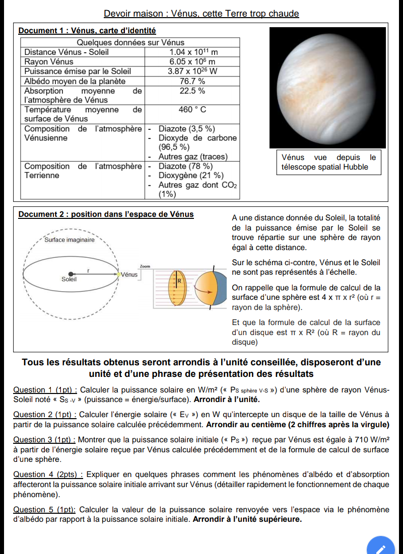 Il s'agit de diviser la puissance solaire par la surface de la sphère de rayon r . les relations sont données dans les documents.