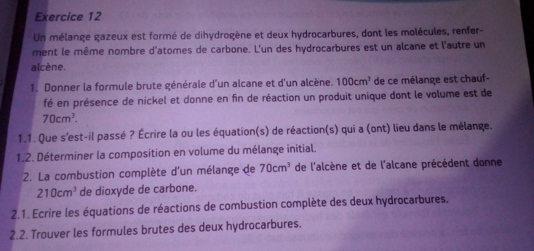 la réponse concernant la formule brute générale d'un alcane et d'un alcène doit être dans votre cours...je vous laisse la retrouver