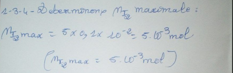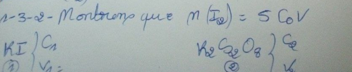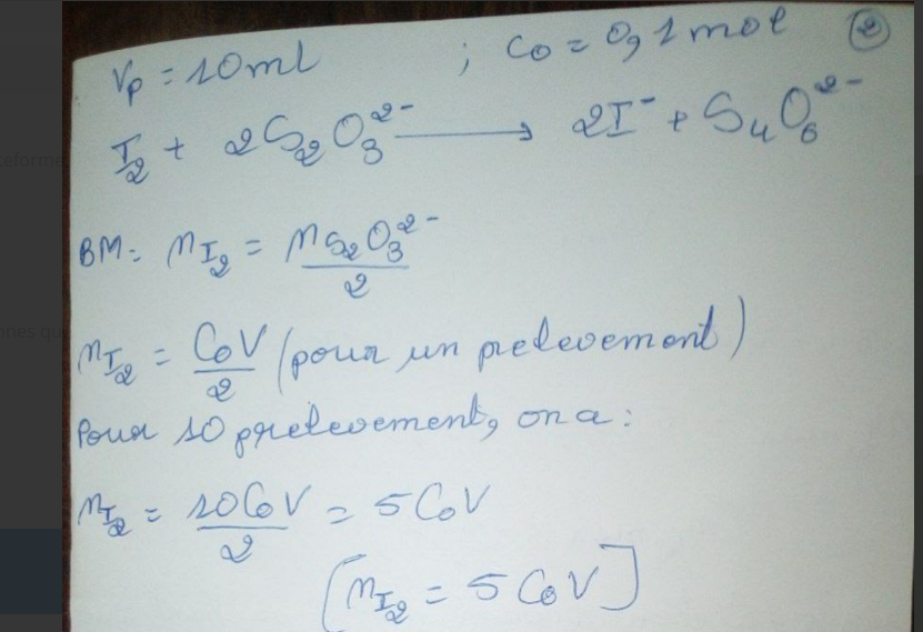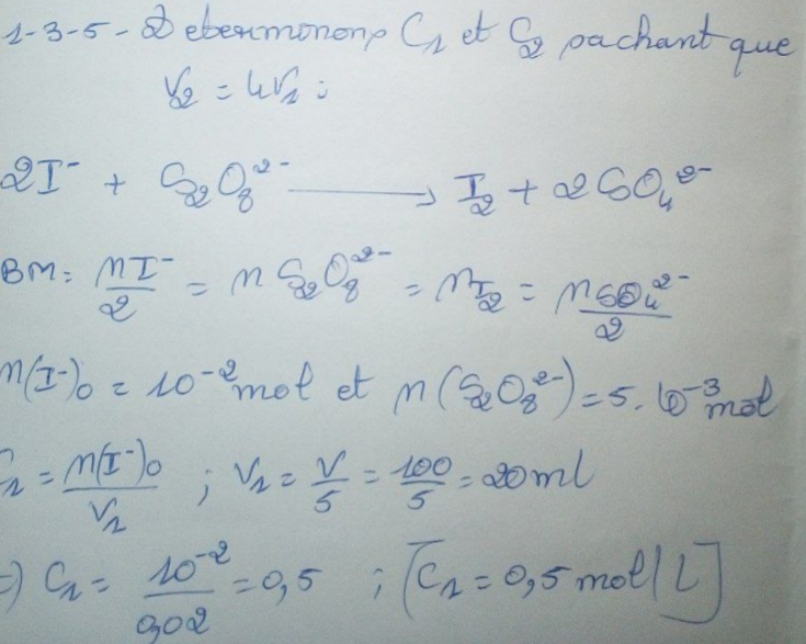 le nombre de moles de I- est 2 fois plus grand puis on divise le volume par 10 donc en quantité de matières il y a un rapport de 10/2 soit 5.