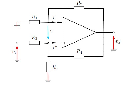 Je dois dire que les hypothèses me perturbent car on dirait qu'on travaille avec un AOP idéal (courant d'entrée nul) mais en régime de Saturation (c'est mon premier exercice que je fais en régime non-linéaire puisque Epsilon est différent de 0.)Pour ce montage, on désire déterminer la condition de fonctionnement en régime linéaire.