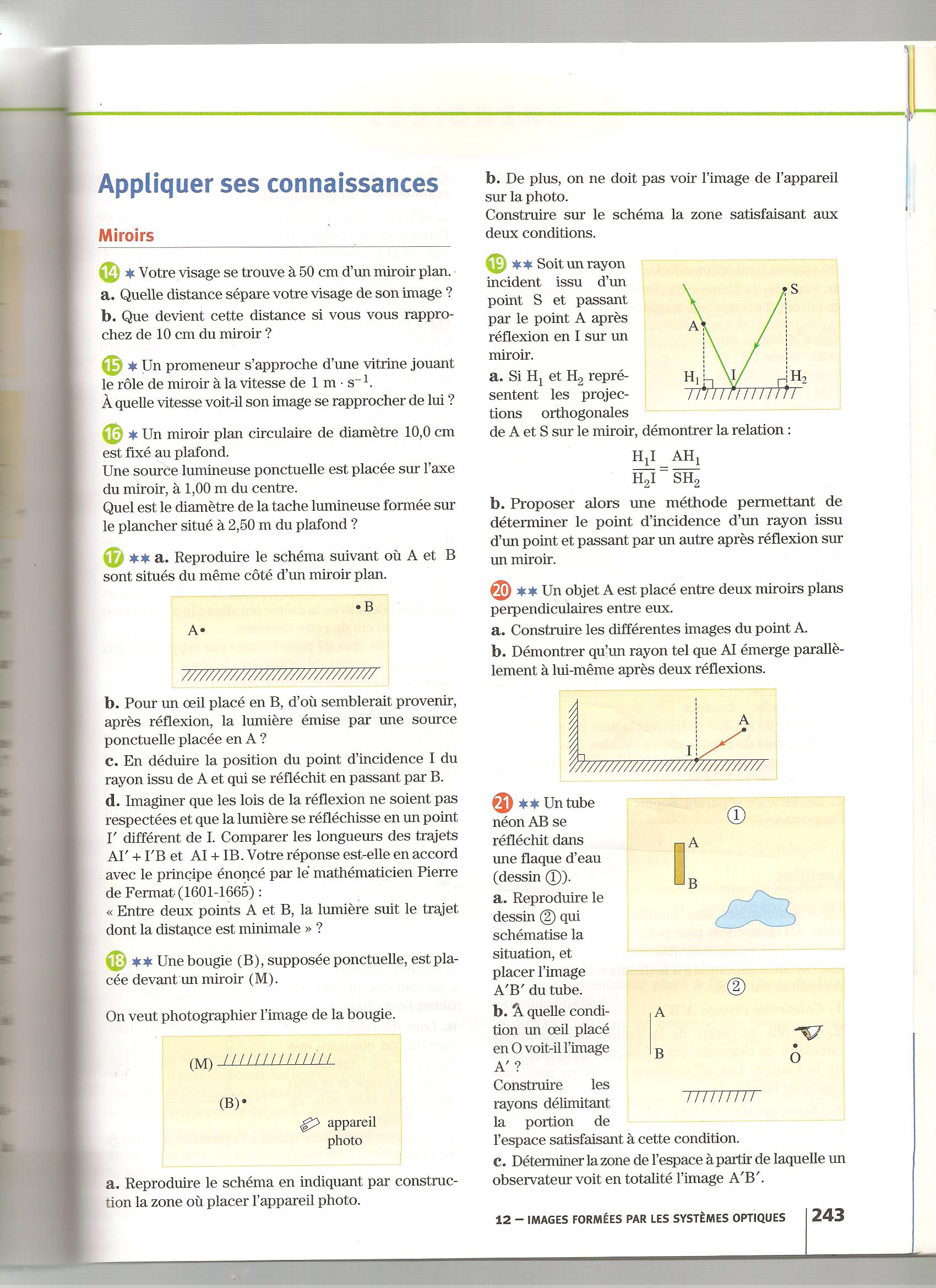 Bonjour, j'ai des exercices pour préparer le contrôle= j'ai fait des schémas mais je ne trouve pas la 17 d) sur les lois de la réflexion je sais que i=r